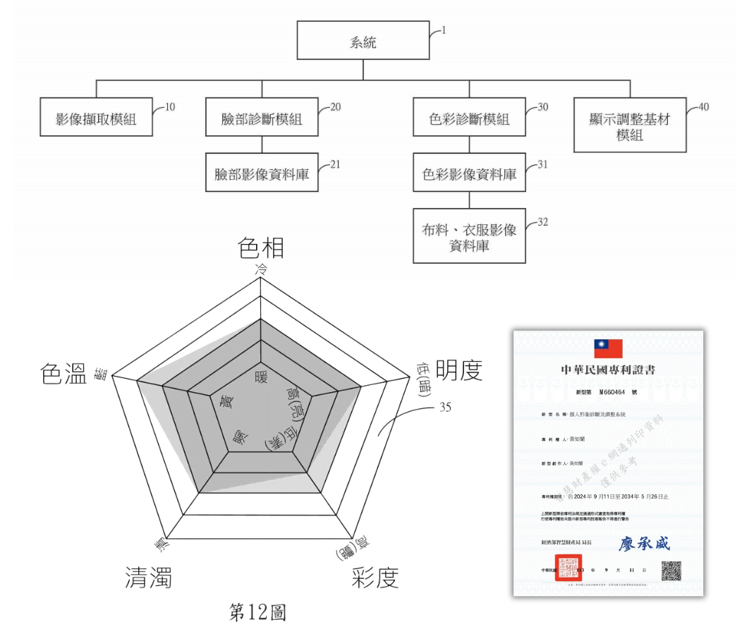 透過該五角圖基本盤量感,可以快速知道缺乏的素材,並利用圖紋配色、材質、款式、首飾、包鞋、配件…等元素進行調整配搭,以完善個人形象,使之更貼合個人特質與需求;利用顯示調整基材模組,顯示調整基材模組與該系統連接,讓受診者獲得調整之素材及元素。